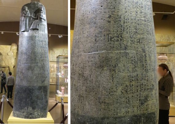 Рис. 4. Стела Хаммурапи. Москва, музей имени Пушкина. Копия-слепок с базальтового оригинала в Лувре. Слева - общий вид. Справа – фрагмент, на котором видны врезанные надписи. Фото автора.